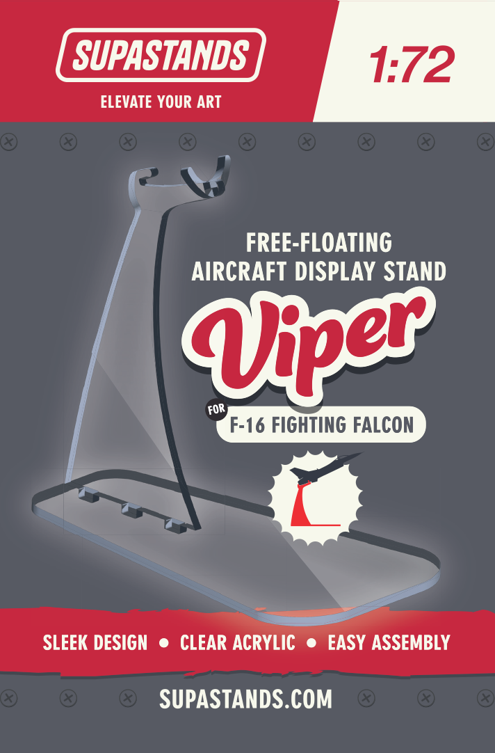 Bring your 1/72 scale F-16 to life with the Supastands Viper display stand. This lightweight, crystal-clear acrylic stand holds your model safely in flight without needing any holes, pins or magnets. Simply place the jet onto the stand: gravity and the precision-cut cradle do the rest.